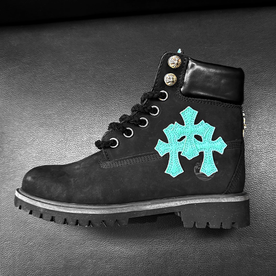 Chrome Hearts(クロムハーツ)とTimberland(ティンバーランド)のコラボアイテム、6インチ プレミアムウォータープルーフブーツへの、セメタリークロス レザーパッチ カスタムが完成致しました♪