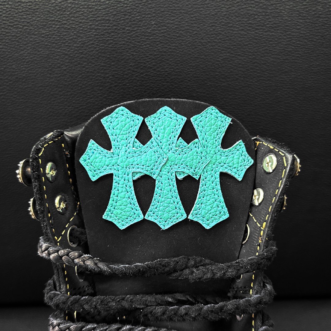 今回のカスタムオーダーでは、お客様からお持ち込みいただいた、クロムハーツティンバーランドのブーツに対し、側面とベロ部分に、クロスパッチをカスタムするという内容で、カラーはティファニーブルーをセレクトいただきました!