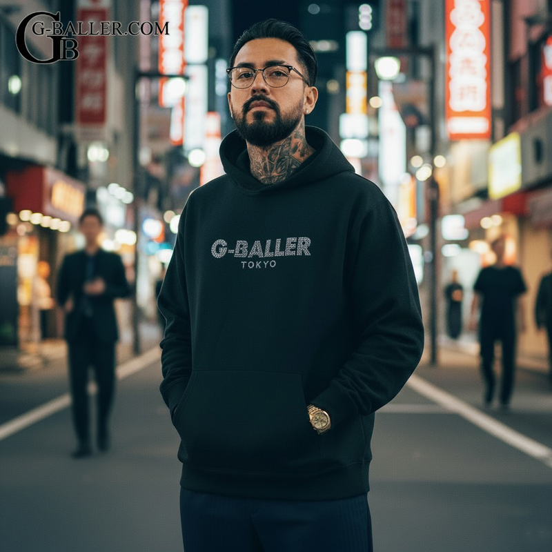 G-BALLER TOKYOロゴを落とし込んだスワロフスキー プルオーバー パーカーです。